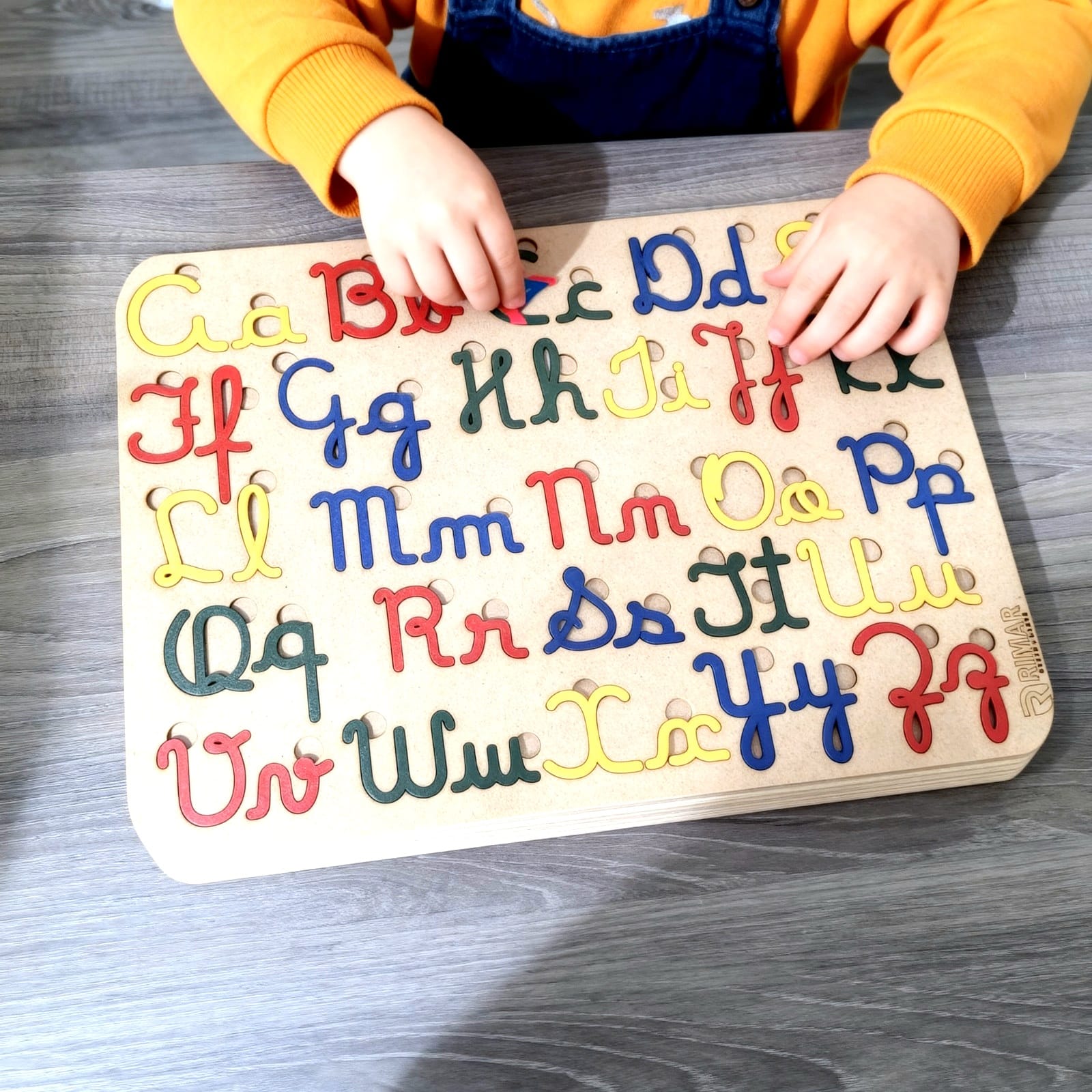 Baseado em princípios pedagógicos, este tabuleiro em madeira oferece um convite à autonomia e à descoberta. Ao tocar e manipular as letras cursivas, a criança desvenda os códigos da escrita de maneira sensorial e natural.